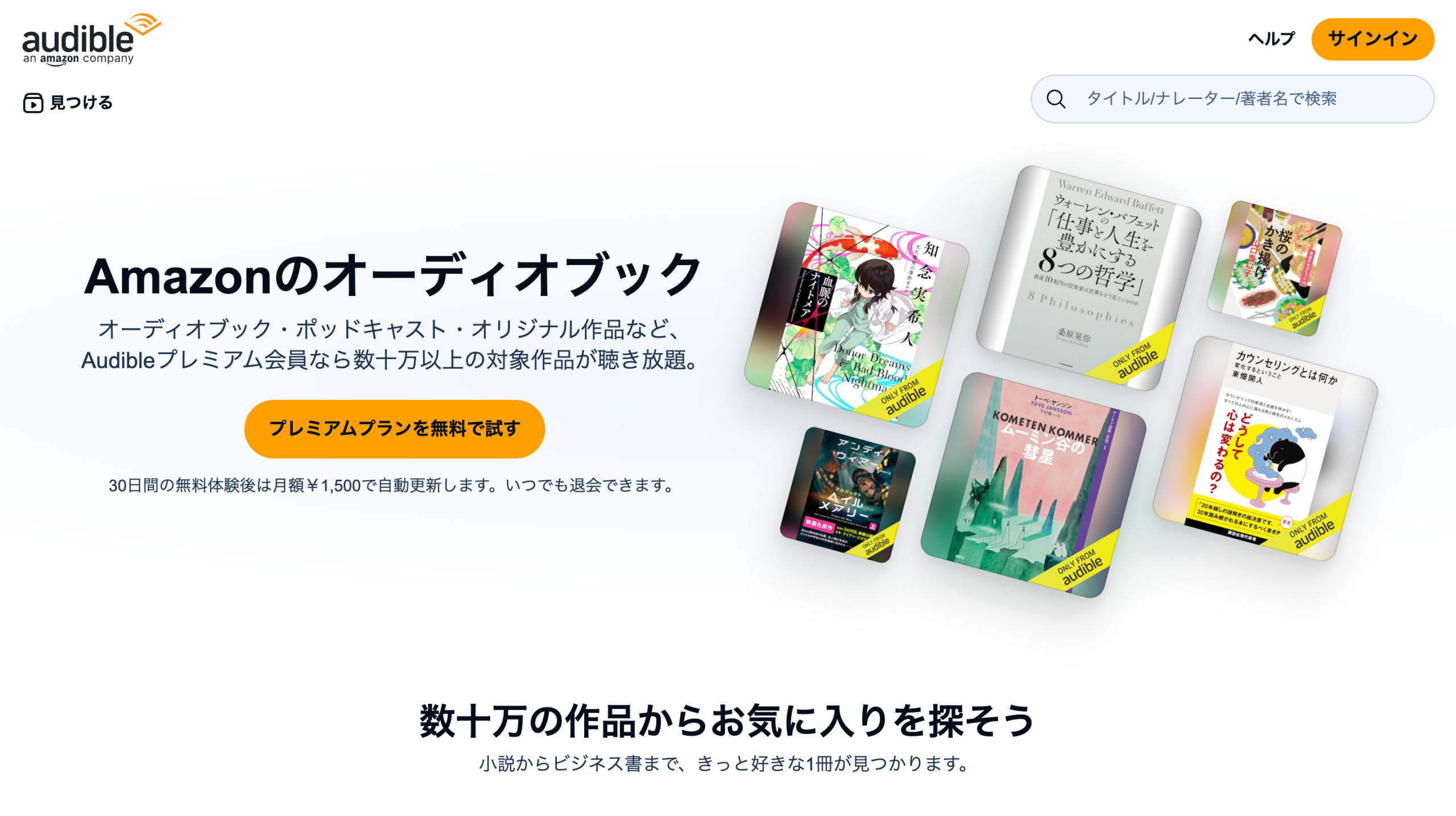 料金は月額1,500円(税込)の聴き放題プランが基本です。対象タイトルであれば何冊でも聴けます。最初の30日間は無料で試せるので、気軽に始められます。