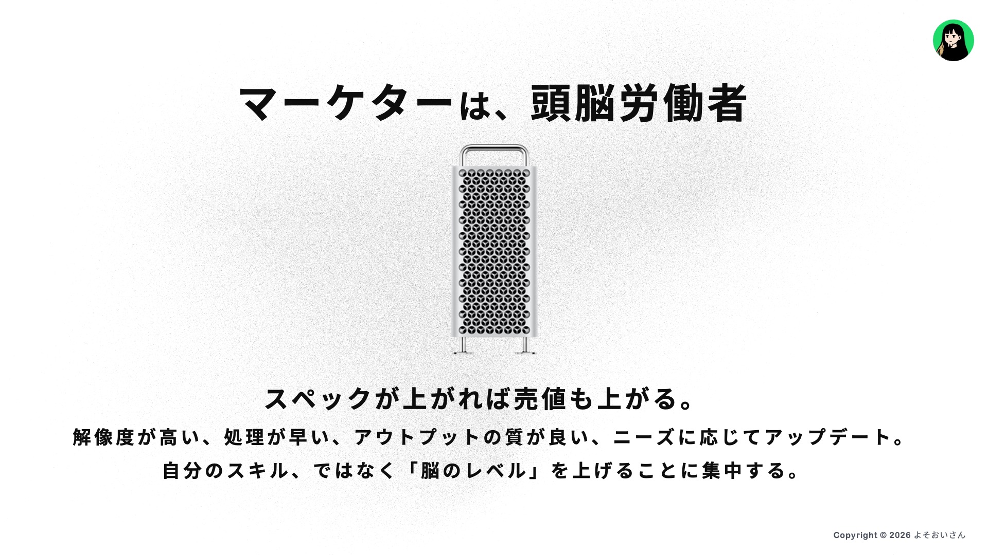 パソコンのスペック表みたいですが、これがマーケターの市場価値を決める要素です。「このスキルがある」ではなく、「この人の頭はどのくらい速く、深く動くか」が問われている。