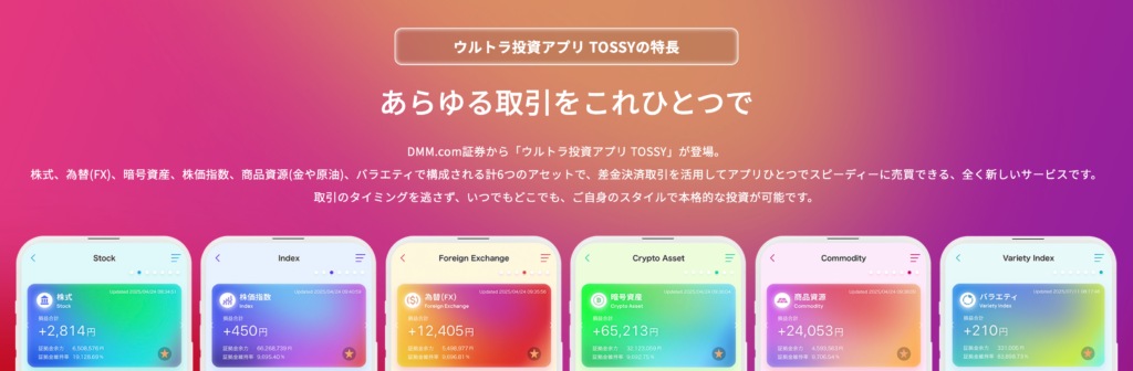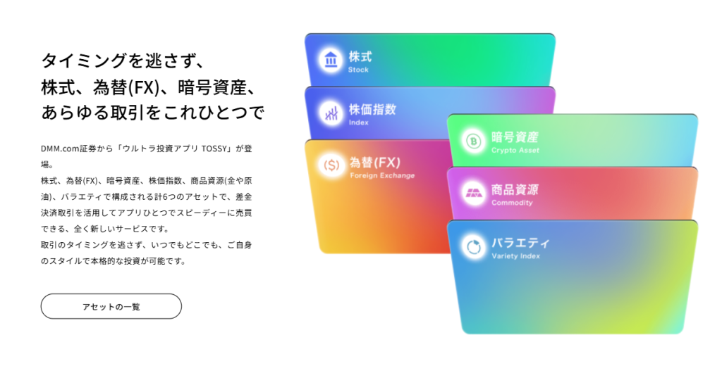 TOSSYの一番の特徴は、株式・FX(為替)・暗号資産・株価指数・コモディティ(金や原油)・バラエティの6種類の資産を、ひとつのアプリで取引できること。