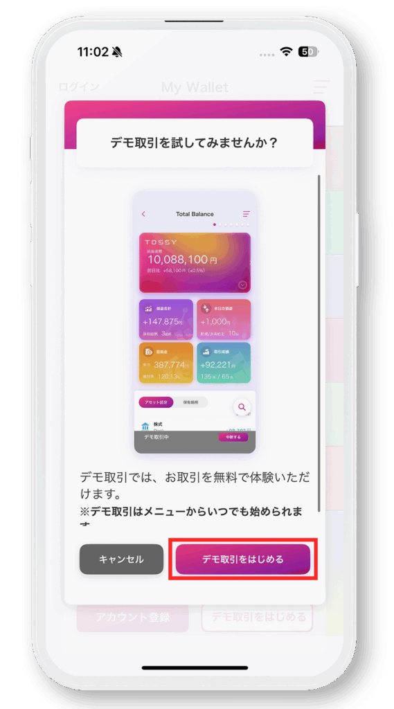 TOSSYにはデモ取引機能がある。本取引と同じ操作感で、自分の資金を使わずにリアルな投資を体験できる。